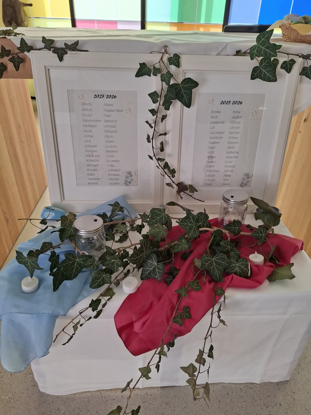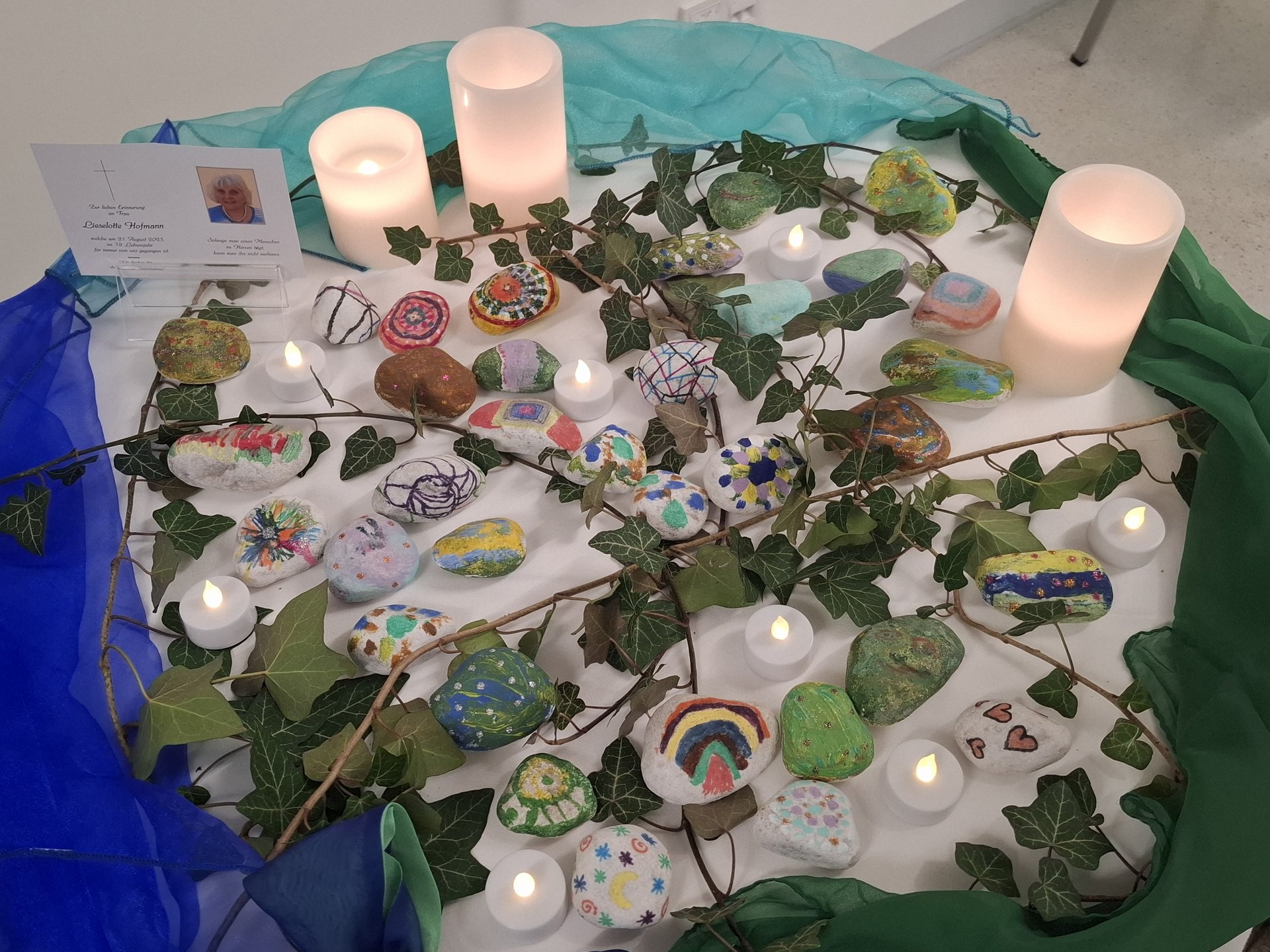 Für jede verstorbene Person der Jahre 2025/26 wurde ein Angehöriger oder ein Mitarbeiter gebeten, nach vorne zu treten, einen bemalten Stein zu nehmen und diesen auf einen geschmückten Tisch zu legen – ein berührender Moment des Erinnerns.