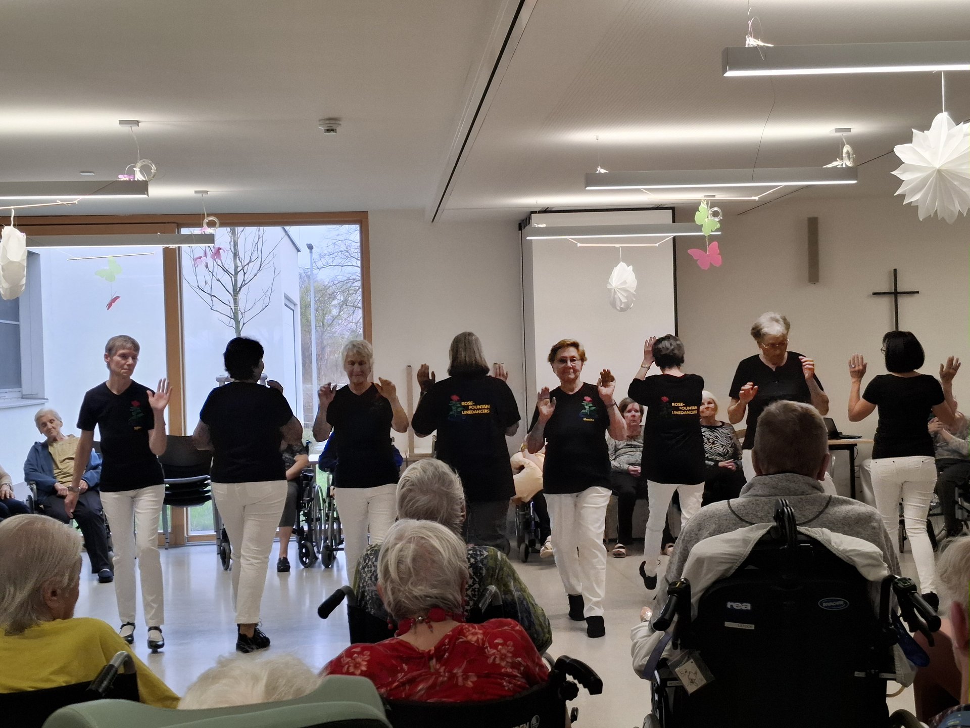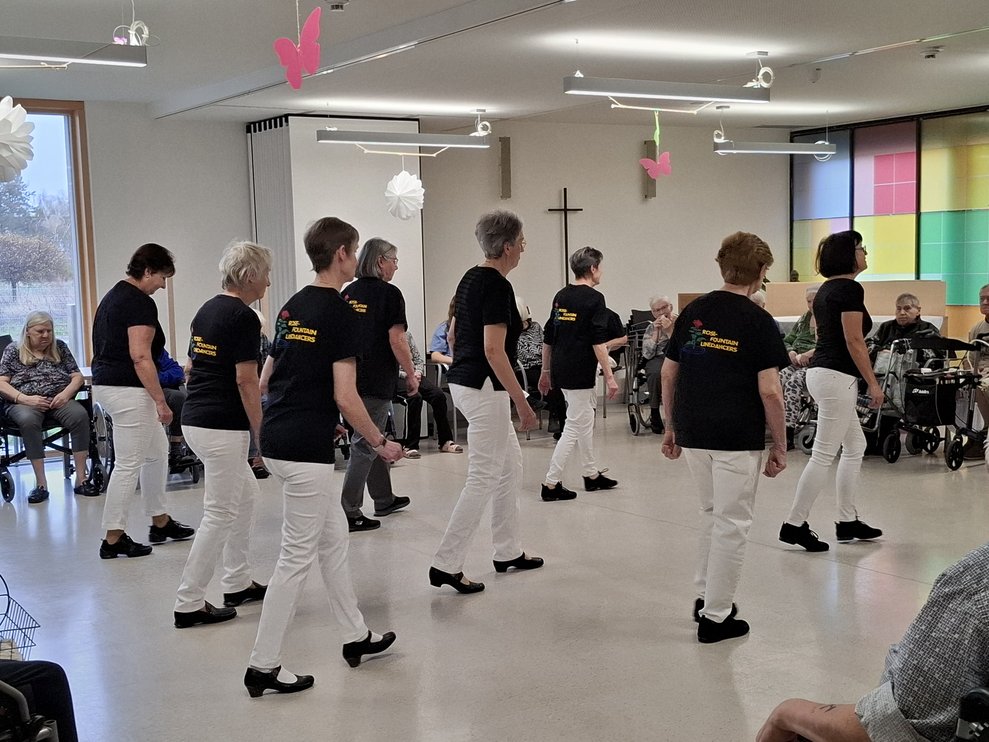 Die Line Dance Gruppe „Rose-Fountain Linedancers“ war zu Besuch im PBZ Korneuburg und sorgte für einen schwungvollen Nachmittag. Auch unsere Bewohnerinnen und Bewohner aus dem Bereich Ringelblume verfolgten die Vorführung mit großer Begeisterung.