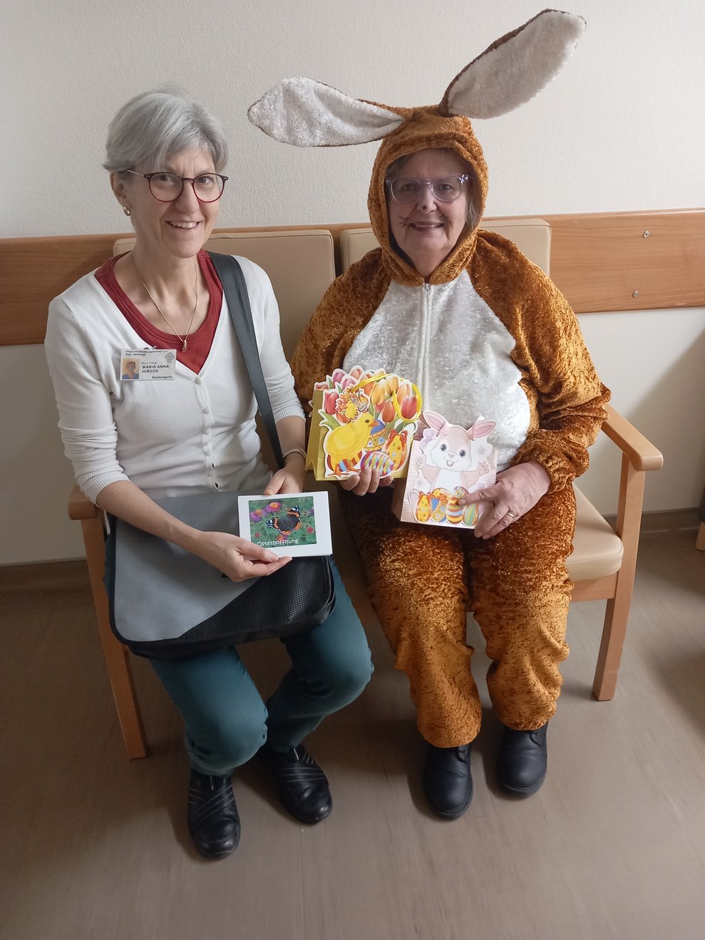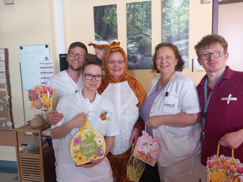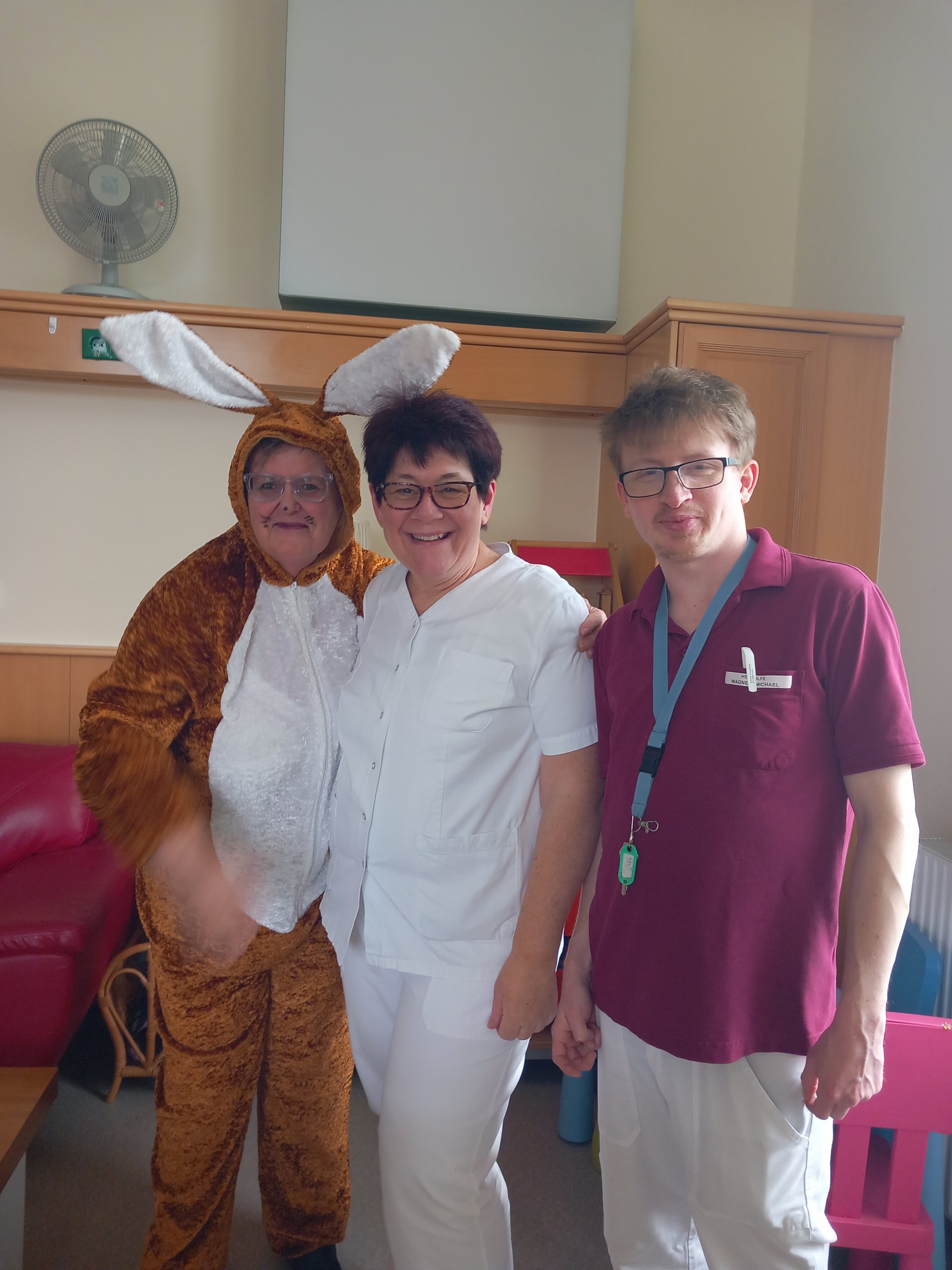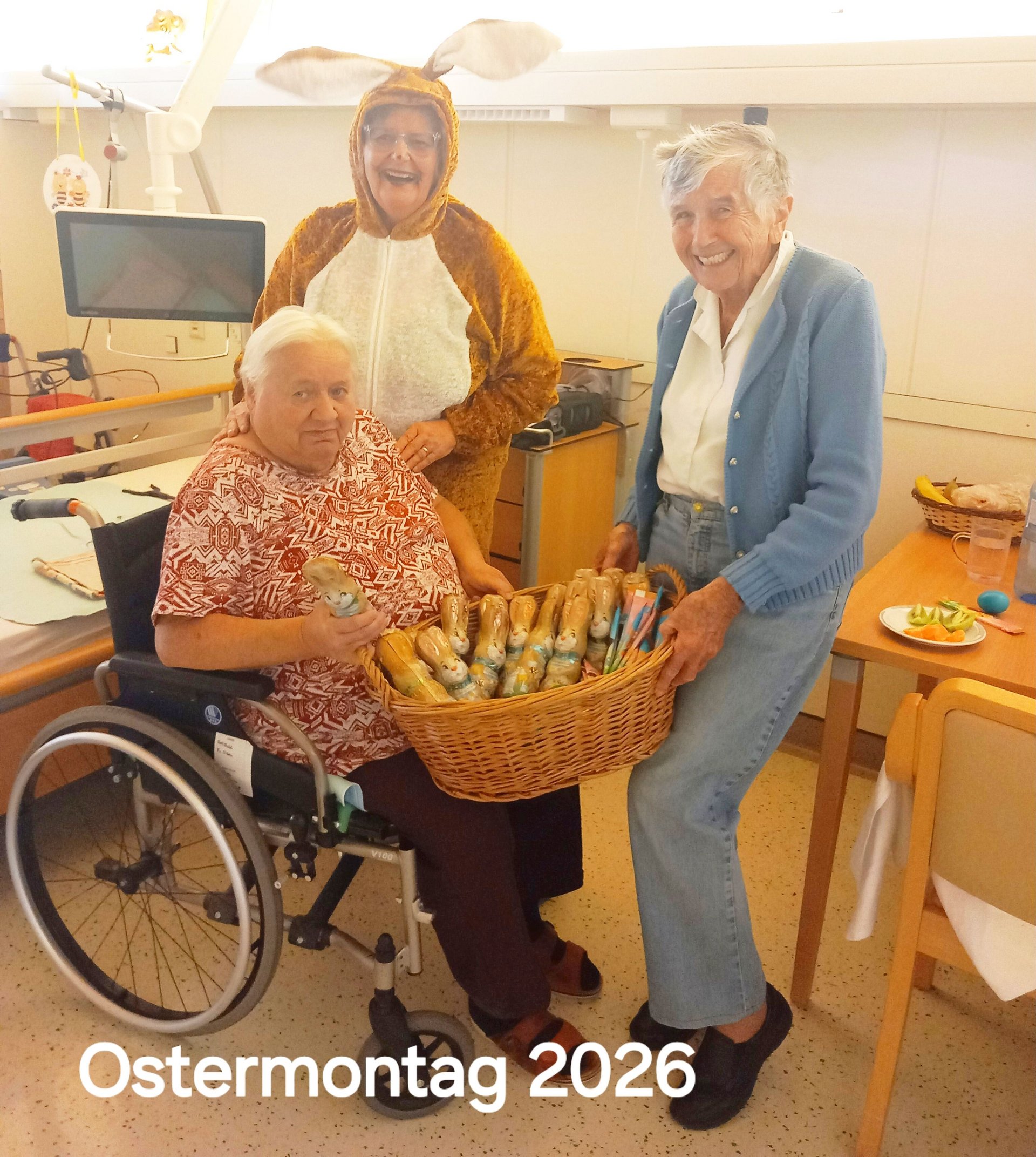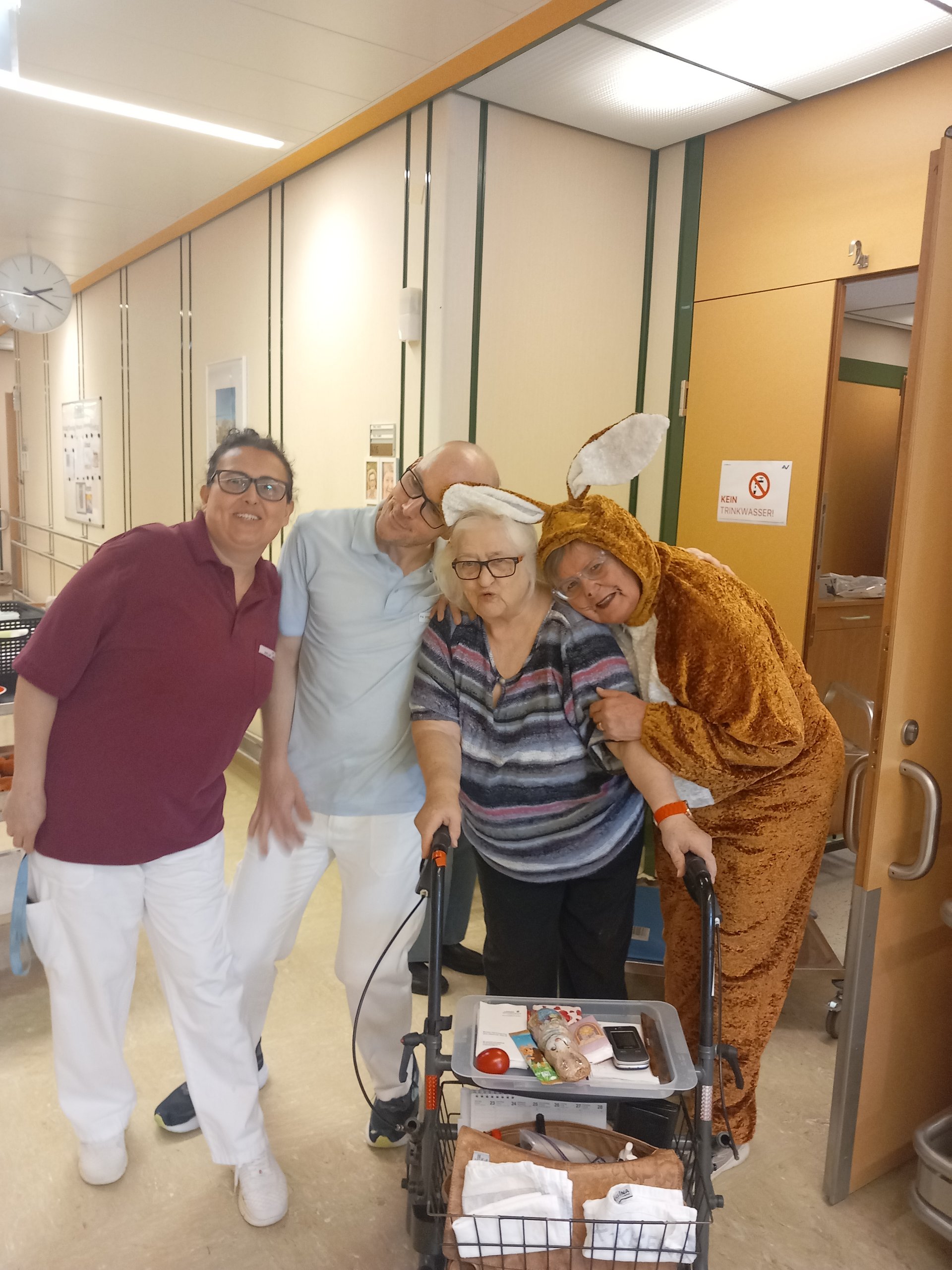 Der Osterhase kam persönlich vorbei und verteilte kleine Geschenke. Unterstützung erhielt er dabei von unseren engagierten haupt- und ehrenamtlichen Mitarbeiterinnen und Mitarbeitern. Die liebevoll organisierte Überraschung kam bei allen sehr gut an und sorgte für viele erfreute Gesichter bei unseren Bewohnerinnen und Bewohnern.