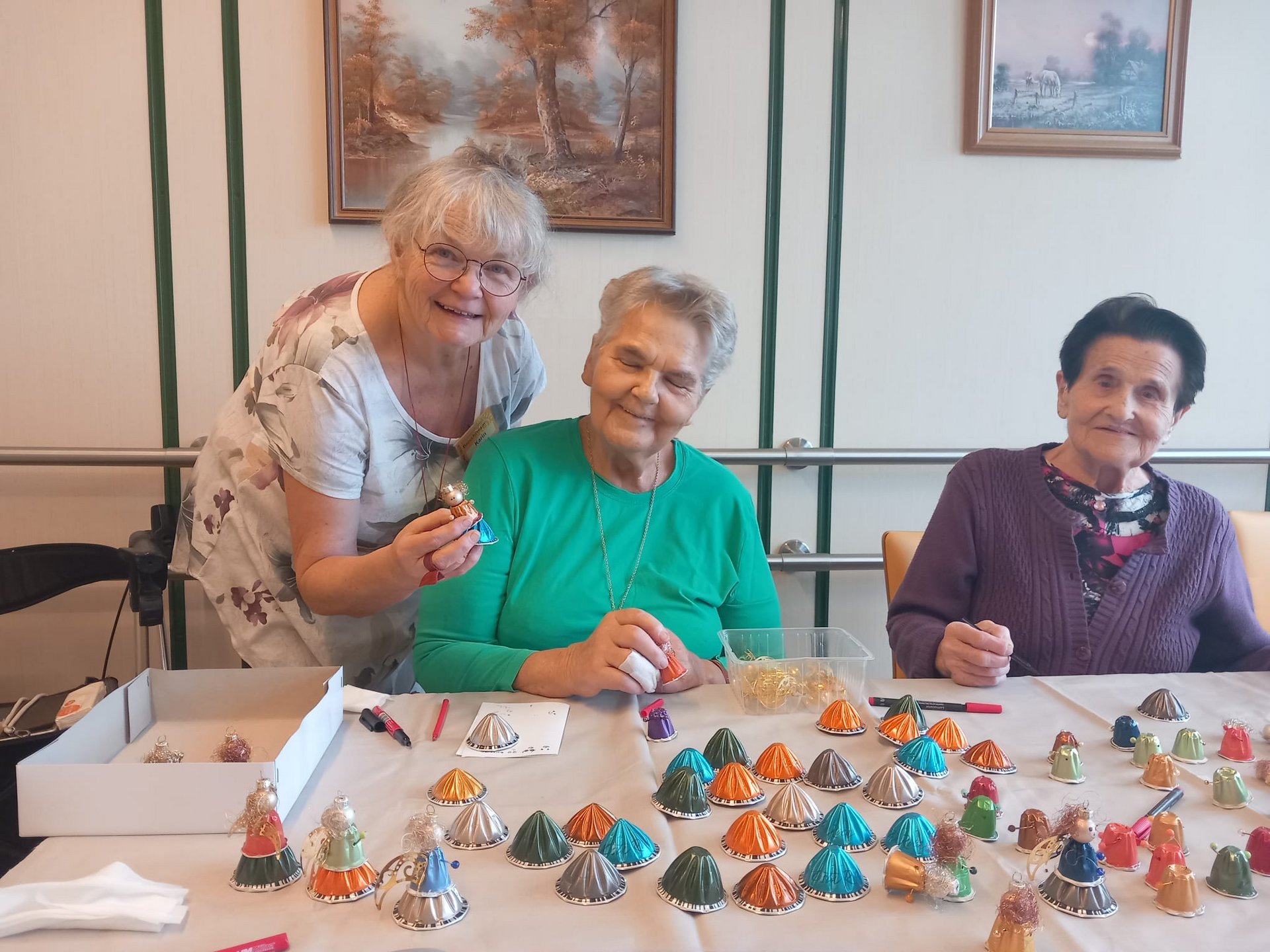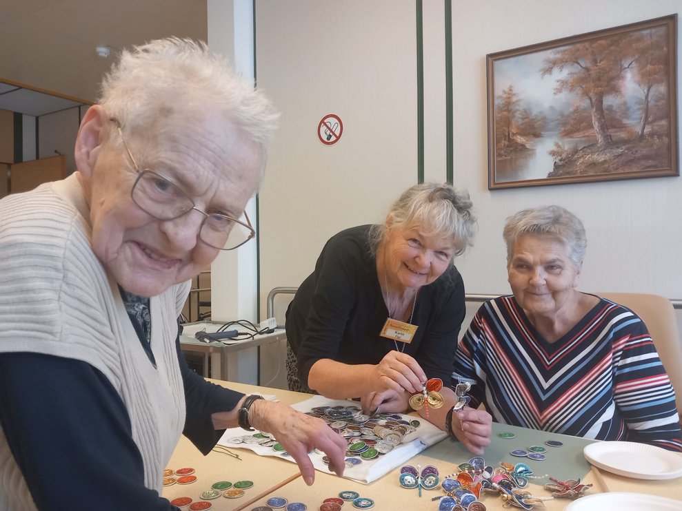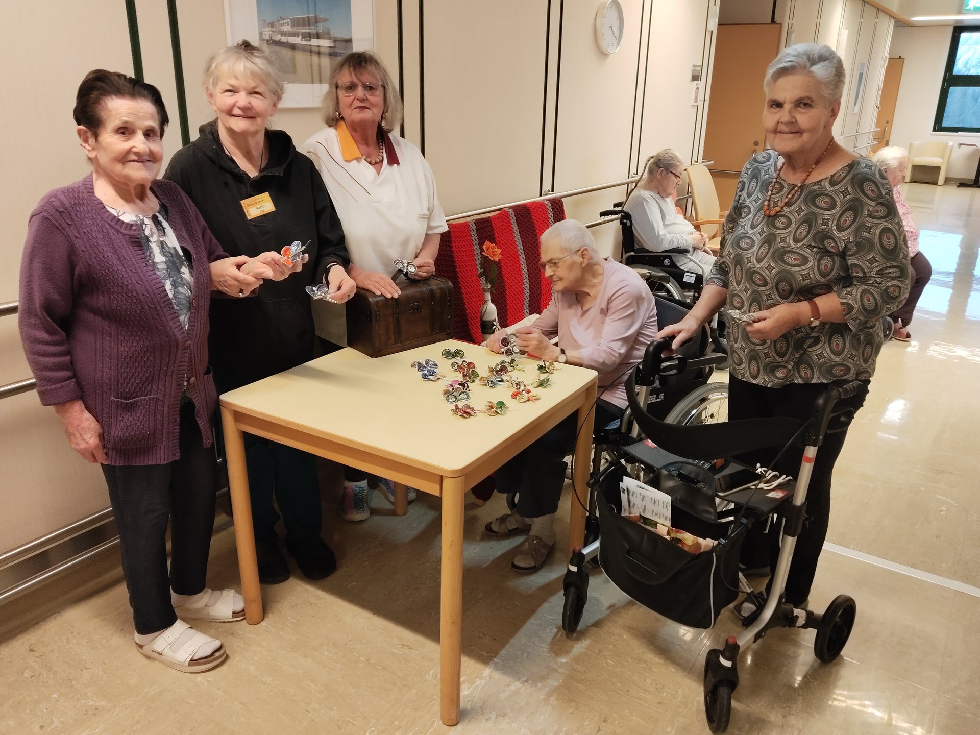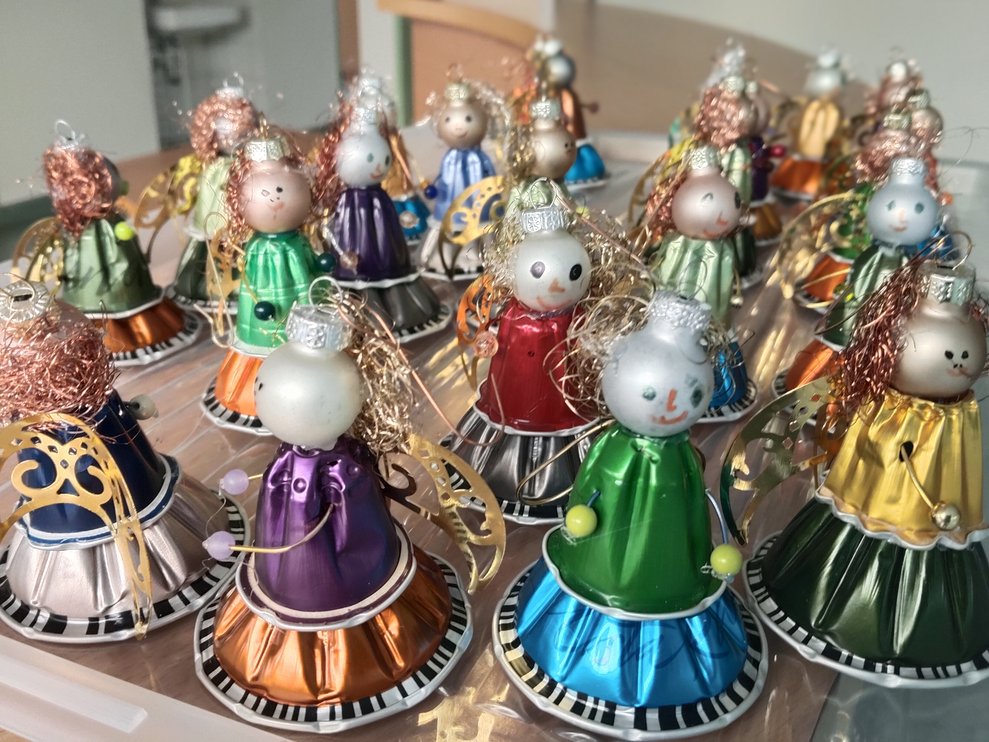 Bereits zur Weihnachtszeit entstanden mit viel Geschick dekorative Engel für den Christbaum. Da die Begeisterung am gemeinsamen Werken ungebrochen groß war und genügend Kapseln gesammelt wurden, entstanden im Frühjahr 2026 farbenfrohe Schmetterlinge. Diese schmücken nun die Zimmertüren der Bewohnerinnen und Bewohner und bringen Farbe und Freude in den Alltag.